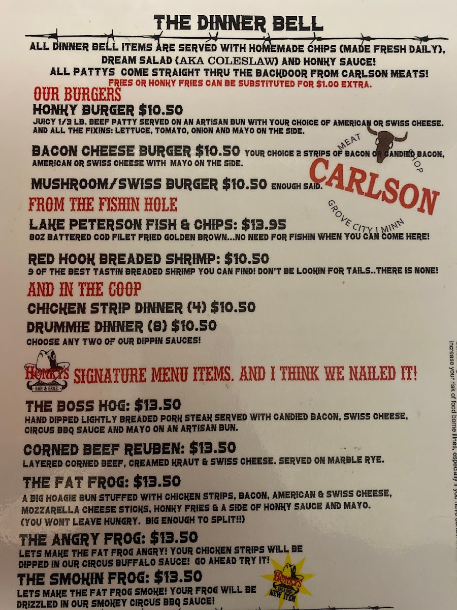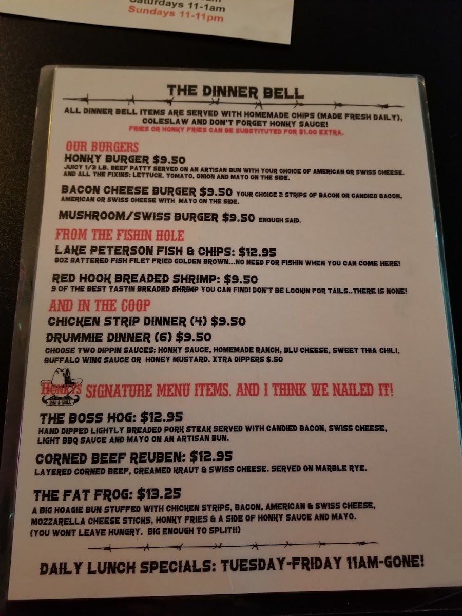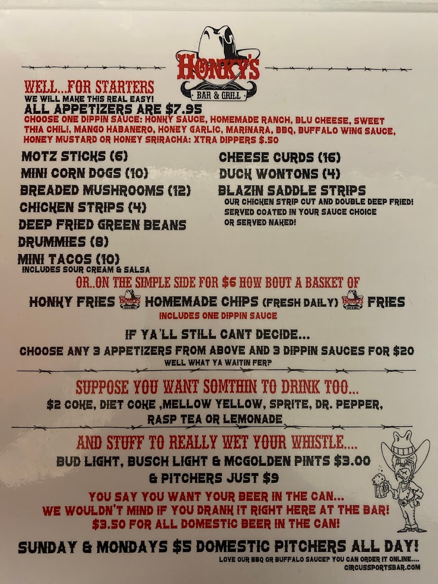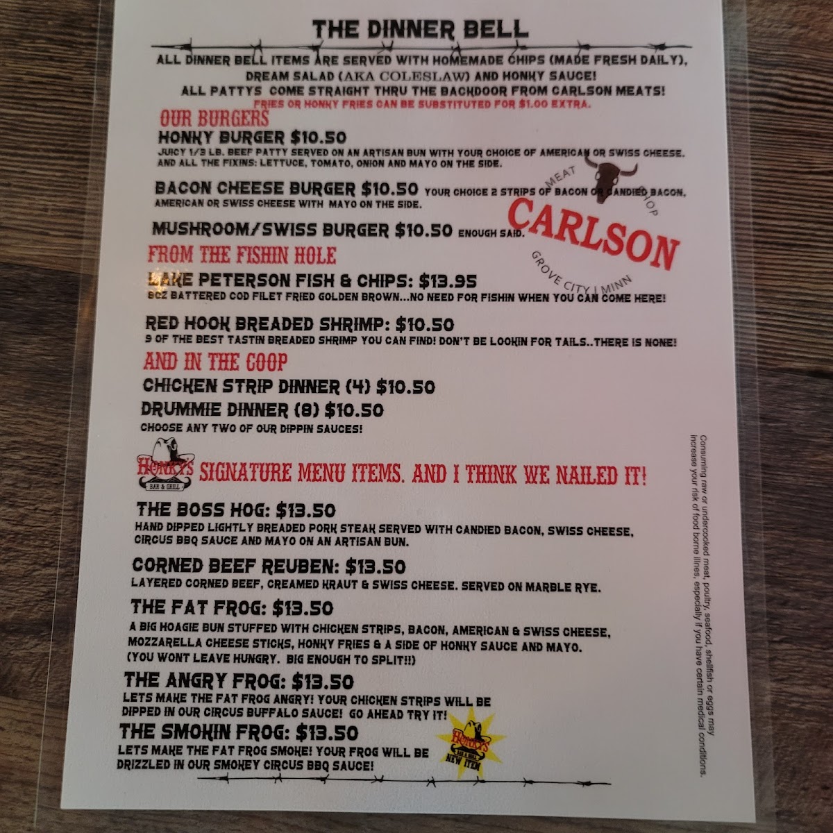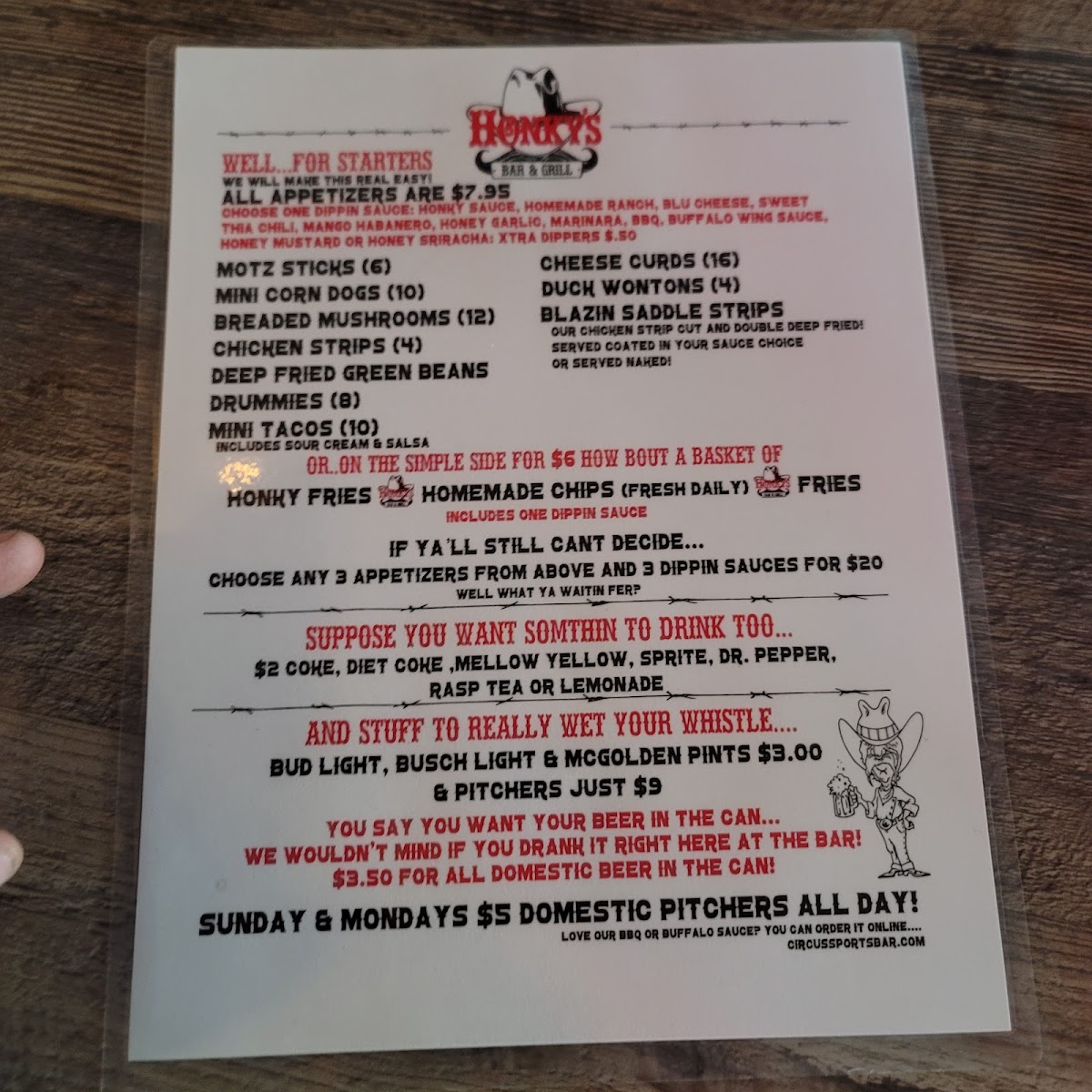 Honky's offers a straightforward bar menu designed for casual, satisfying bites and comforting drinks in a relaxed setting. Whether you're stopping by for a late lunch, unwinding after work, or gathering with friends on the weekend, the menu matches the easygoing atmosphere with a mix of classic pub favorites and hearty options.